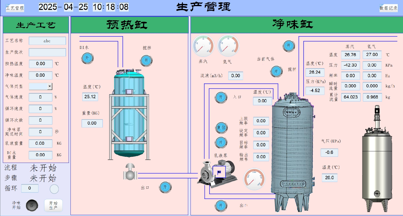 乳液净味生产系统,是给汕头某实验室做的一套自动化生产系统。系统通过PLC控制整个生产流程,预设生产参数后,PLC实时采集传感器数据,根据预设参数,控制生产过程中的各种乳液阀门和蒸汽阀门,达到自动生产目的。